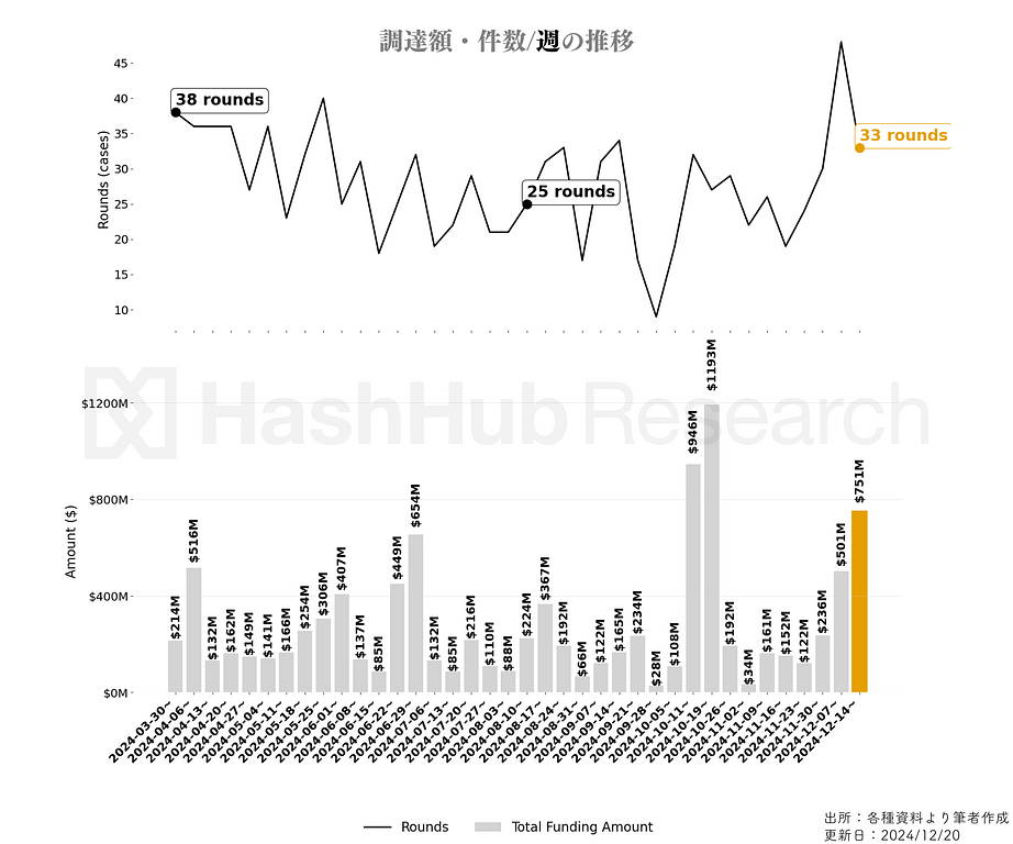直近一週間の投資ラウンド件数/週は33件、公開情報に基づく調達額/週は約$751M(※非公開情報は含まれません)です。