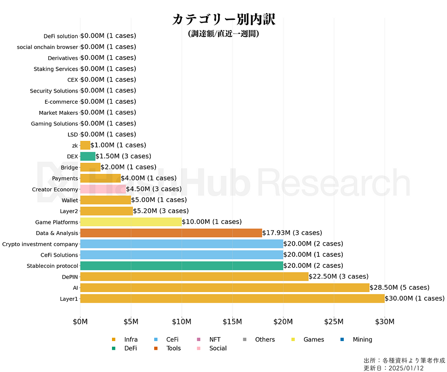 より細かな分類(上図)では、CEX事業(28.5M/5件)、DePIN($22.5M/3件)に比較的多くの資金が流れていることを確認できます。