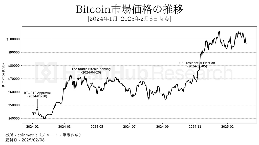 昨年2024年は1月10日のBTC ETF承認、4月20日のビットコイン半減期、11月5日の米国大統領選挙といった重要なイベントが価格推移に大きな影響を与え、これらを通じてBTC市場の構造が大きく変化した一年となりました(図表2)。ETF承認は機関投資家の参入を促進し、初動の価格上昇を引き起こし、つづく半減期は供給減少への期待とともに一時的な調整局面をもたらし、米国選挙では規制緩和への期待が高まり、市場を再び上昇軌道へと導きました。