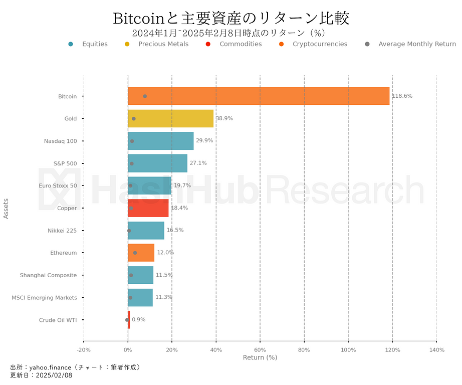 2024年のビットコイン(BTC)は、年初の42,208ドルから最高値108,786ドルに到達し、年末にはおよそ95,000ドル前後を推移しました。2024年1月から執筆時点(2025年2月8日)までのリターンは118.6%に達し、同年のゴールド(38.9%)、ナスダック100(29.9%)、S&P 500(27.1%)を大きく上回る結果となりました(図表1)。