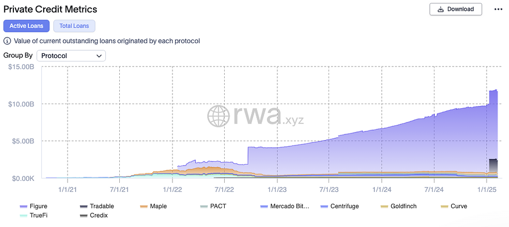 プライベートクレジットに焦点を当てると、プライベートクレジット(特に住宅ローン担保の証券化)をトークン化するプラットフォームを提供するFigure社が圧倒的な市場シェアを占めています。彼らはHELOC(Home Equity Line of Credit)のトークン化に特化しており、住宅ローン担保を提供するプライベートクレジット市場をターゲットにしています。その規模は、Figure単体で92億ドルものアクティブなローンを展開し9割以上を占めています。