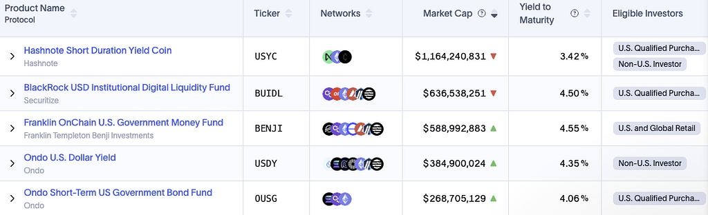 時価総額では、HashnoteのUSYC(約11.6億ドル)、BlackRockのBUIDL(6.3億ドル)、Franklin TempletonのBENJI(5.8億ドル)がトップ3となっています。