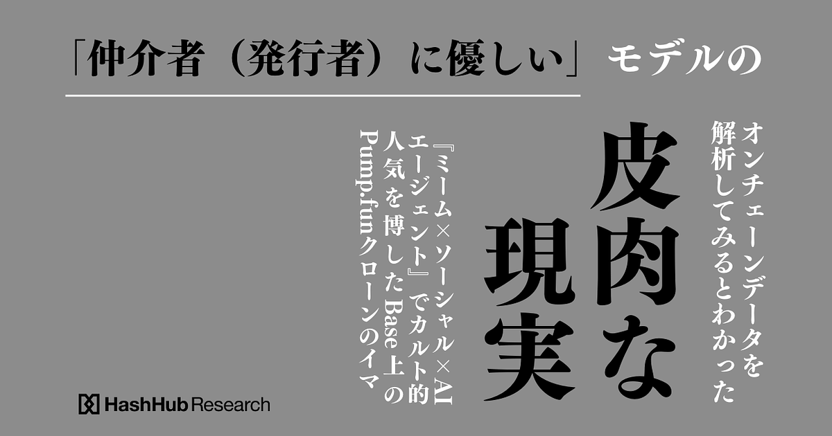 『ミーム×ソーシャル×AIエージェント』という組み合わせ、皆さんはどう感じているでしょうか。一種の社会実験と見ることもできる反面、ブーム当時にあふれていた(ポジティブがすぎる)曖昧な主張だけでは物足りなさを覚える方もいらっしゃるかもしれません。オンチェーンデータがそれなりに蓄積されている今、一度データを整理して、実際にあの実験はどのような結果になったのか、またこのポジションならどの程度の収益が見込めたのか、といった分析をしてみてもよいのではないかと思いました。そこで、昨年暮れに一世を風靡したBase上のあるPump.funクローンのビジネスモデルについて、私見を交えた考察をコラムとしてまとめることにした次第です。