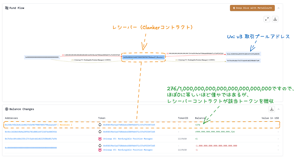 ※1)ユーザーがトークンを発行する際、手数料は発生しないと述べましたが、正確には発行トランザクションでレシーバー(Clankerのコントラクト)が発行したトークンのごくわずか(実質0に近い)を徴収し、その残りをUniswap v3の取引プールに片側流動性として投入してプールを作成しています。図3:トークン発行時のTxフローとトークンバランスの変化(参考Tx:0x3ab4c4ffa07993a85f96052afc51c6485adde996f890ed43c0fdd59e1140d97e)