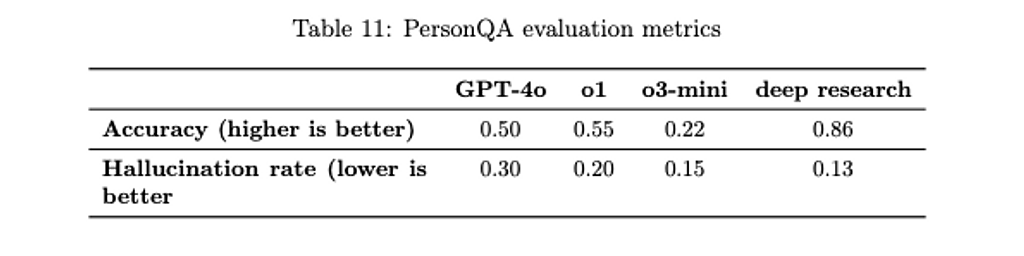 OpenAIのDeep Researchは、OpenAI以外のモデルを含むAIモデルの性能評価テスト(Humanity’s Last Exam)において、現時点で他のモデルを圧倒する性能があり、ハルシネーション(幻覚)対策も他のOpenAIモデルより優れているという結果が示されています。