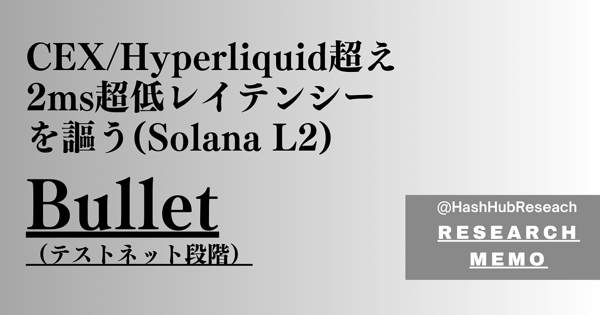 本メモは、2025年3月にテストネットを公開したSolana初のL2「Bullet」に関する要点を整理したものです。Bulletは、CEXを超える2msの超低レイテンシーを実現する分散型取引ネットワークであり、Hyperliquidの100倍、既存のSolana DEXの200倍の高速処理を可能にするとされています。高頻度取引に最適化された専用レイヤーとして設計され、Zeta Marketの進化形として誕生。取引の透明性を維持しながら、パフォーマンスとスケーラビリティを両立する革新的なDEXインフラです。以下、ご参考ください。