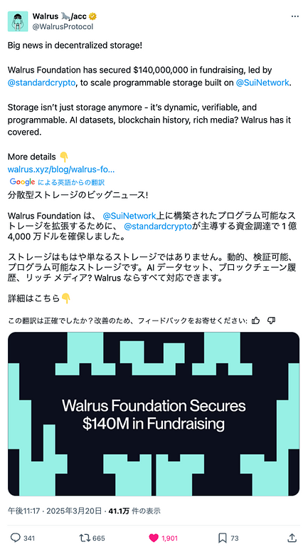 Suiエコシステムにおける分散型ストレージプロジェクト、Walrus Protocol(Move言語対応のFilecoinのような存在)が、大規模な資金調達を実施し、一部の業界関係者の間で注目を集めていたため、その概要を備忘録的にまとめておきます。