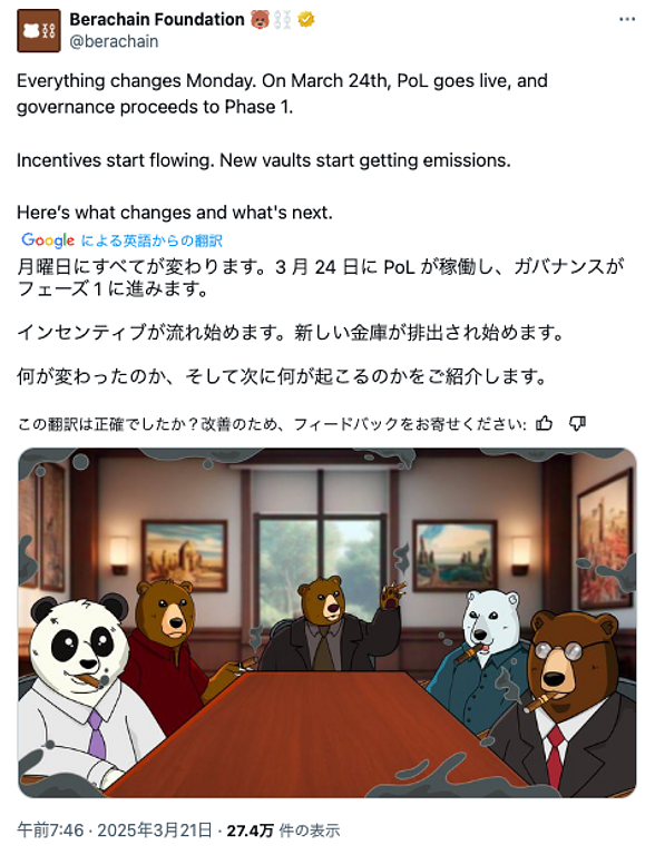 2025年3月24日、新興のレイヤー1ブロックチェーン「Berachain」が、新たなコンセンサスメカニズム「Proof of Liquidity(PoL/流動性証明)」を正式に稼働させ、オンチェーンガバナンスのフェーズ1をスタートしました。この仕組みによって、ネットワークのセキュリティ確保(ステーキング)と、DeFiプロトコルへの流動性供給を同時に実現できるようになり、エコシステム全体のインセンティブ構造に大きな変化がもたらされます。