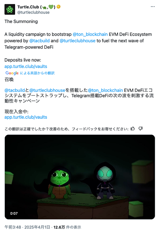 キャンペーンはTON Applications Chain (TAC)と呼ばれるTONのEVM対応レイヤーを開発するプロジェクトと、ユーザーへのインセンティブ配布を専門とするTurtle Club(タートルクラブ)によって主導され、さらにインフラ提供者のVeda Labsなど複数のエコシステムパートナーが協力しています。要するに、TACによる技術基盤とTurtle Clubhouse(Turtle DAO)による報酬設計のもと、Ethereumメインネットなど他チェーンからTON上のDeFiに大量の流動性と有力プロトコルを誘致する試みです。