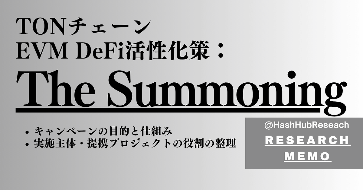 本メモは、TONブロックチェーンにおけるEVM対応のDeFi活性化施策「The Summoning」キャンペーンについて、その概要を簡潔に整理したものです。Telegram発のネットワークであるTONが、Ethereum系プロトコルおよび外部資産の受け入れを本格化させる中、当該キャンペーンは流動性の獲得とエコシステム拡大に向けた重要な一歩と位置付けられます。