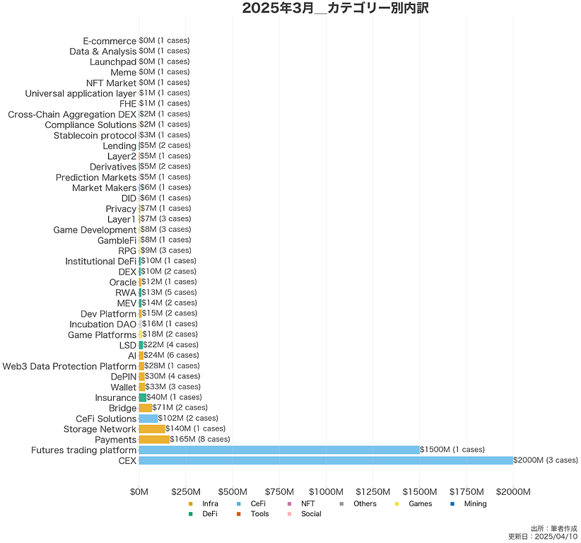 2025年3月は、暗号資産業界における資金調達の動きが再び活発化した月となりました。金額ベースではCeFi(中央集権型金融)が圧倒的な存在感を示し、なかでもCEX(中央集権型取引所)関連が約20億ドル、Futures(先物取引)関連が約15億ドルと、合計で全体の約7割を占めています。