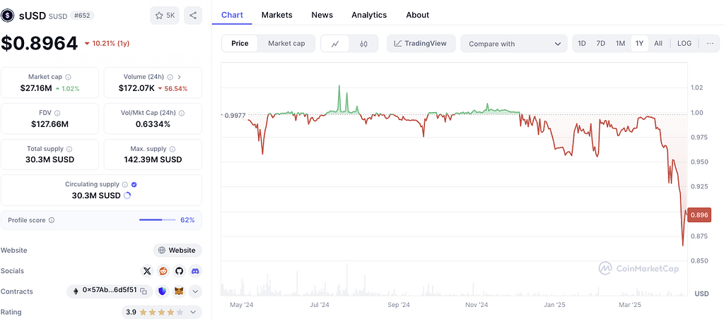 2025年4月、合成資産プラットフォームSynthetixが発行する暗号資産担保型ステーブルコイン「sUSD」が大幅にドルペグを外れる事態が発生しました。過去にも小規模なペグ乖離は散発的に起こっていましたが、今回は最大で16%超もドル価格(1USD)を下回る深刻さとなり、20日以上にわたり乖離が回復しませんでした。