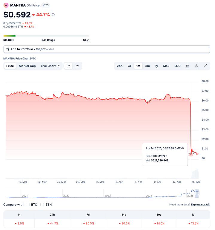 暗号資産市場は、その成長性とイノベーションの裏側に、大きな価格変動リスクを常に孕んでいます。2025年4月14日、リアルワールドアセット(RWA)のトークン化を掲げるL1プロジェクト「Mantra」のネイティブトークンである$OMが、わずか1時間で90%以上の暴落を記録し、市場に衝撃を与えました。