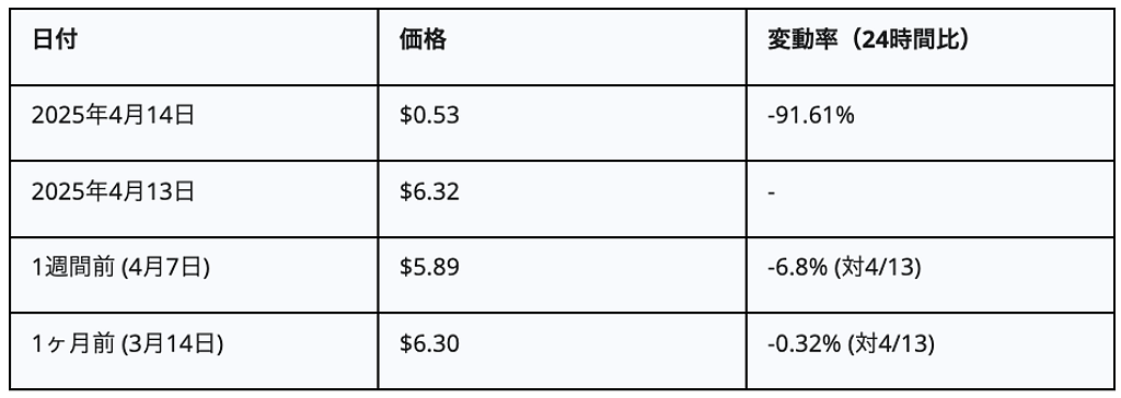 価格変動の規模は極めて大きく、トークン価格は暴落前の約6.30ドルから、一時0.37ドルから0.50ドル付近まで、実に90%近く下落しました。これにより、ピーク時には60億ドルを超えていた時価総額は、一時的に7億ドル前後にまで急減しました。