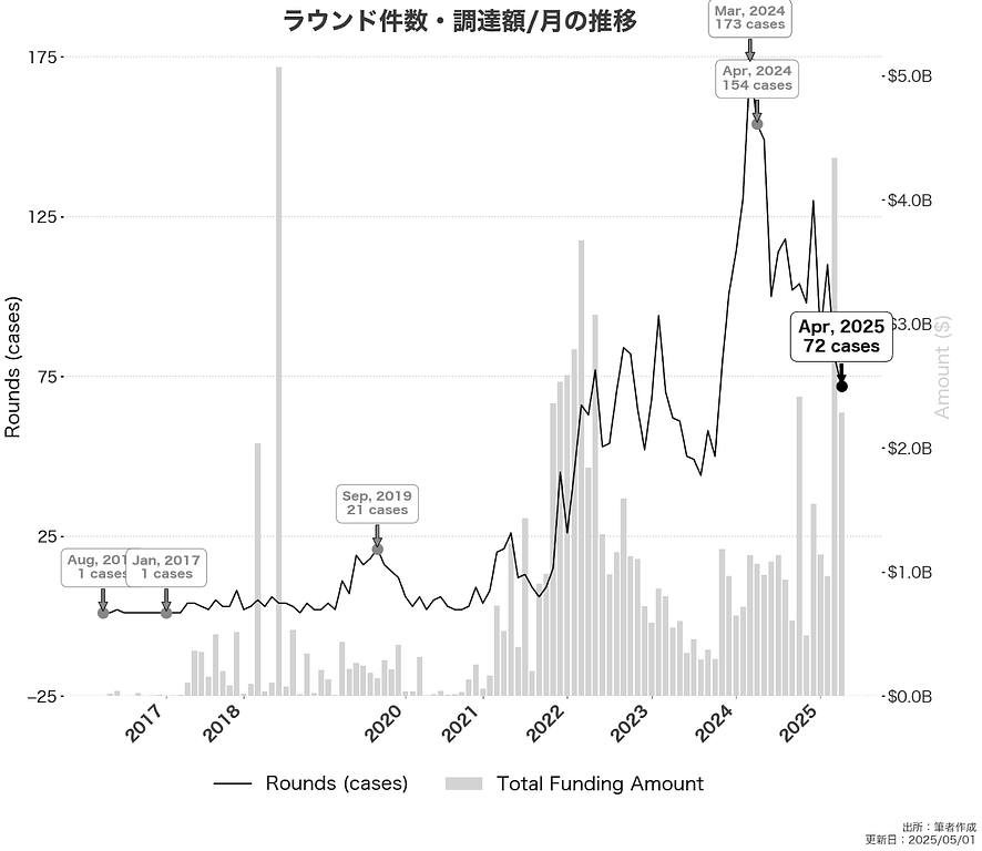 2025年4月のWeb3.0領域における資金調達は、件数ベースで72件と、前月(3月)の81件からさらに減少しました。昨年4月の154件と比較しても半数以下の水準となっており、件数ベースでの調整局面が続いている可能性が示唆されます。