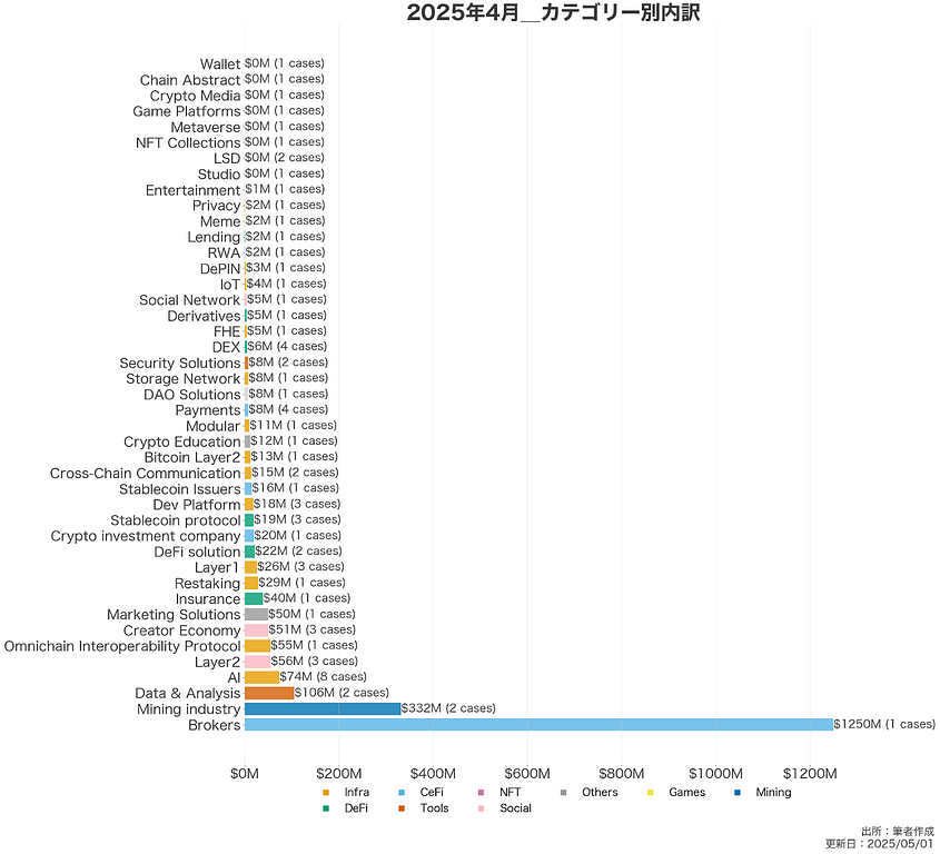2025年4月の暗号資産業界における資金調達は、金額ベースで見ると大型M&A案件やCeFi(中央集権型金融)関連が引き続き市場を大きく牽引しました。一方で、件数ベースではAI(人工知能)を含むインフラ(Infra)領域やDeFi(分散型金融)領域が活発であり、多様な分野でイノベーションに向けた投資が継続していることが示されました。
