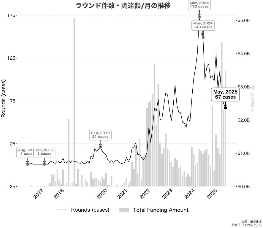 - 2025年5月の資金調達件数と調達額の推移