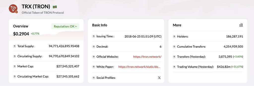 主なネイティブ資産であるTRXトークンはネットワーク手数料支払い、ガバナンス投票(ステーキング)などに利用される基軸通貨で、発行上限は無制限ですが後述のとおり現在は供給減少局面にあります。