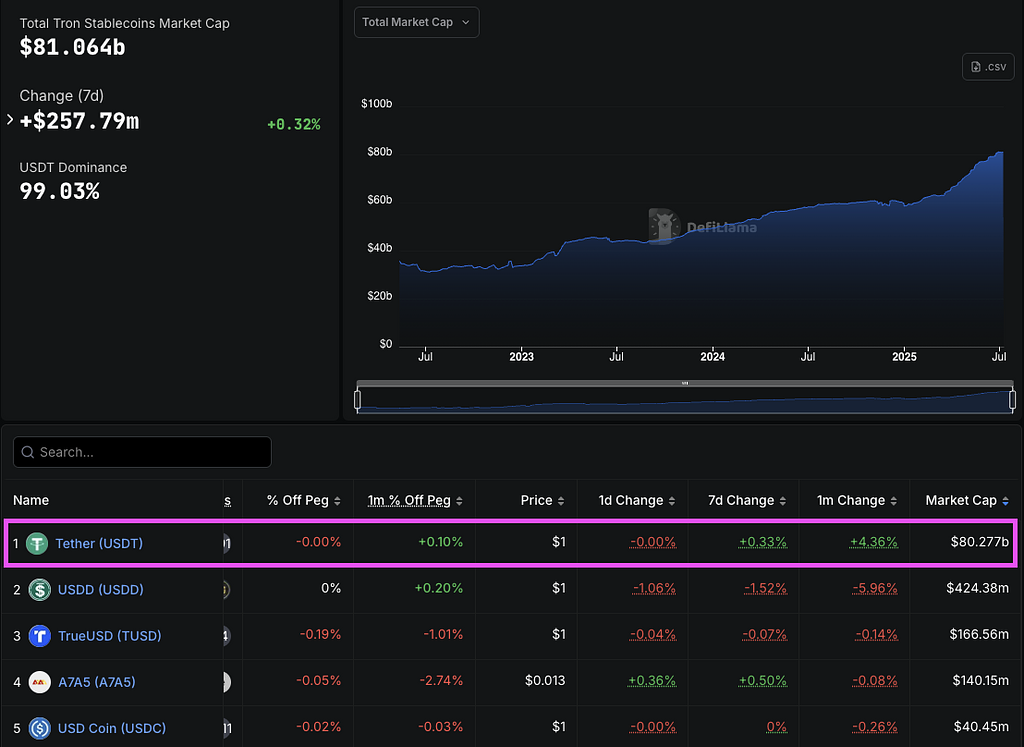 特にテザー社の発行するUSD連動型ステーブルコインUSDTの主要流通基盤であり、2025年6月時点でUSDTの総供給の半数以上にあたる約800億ドル相当がTRON上で発行・流通しています。