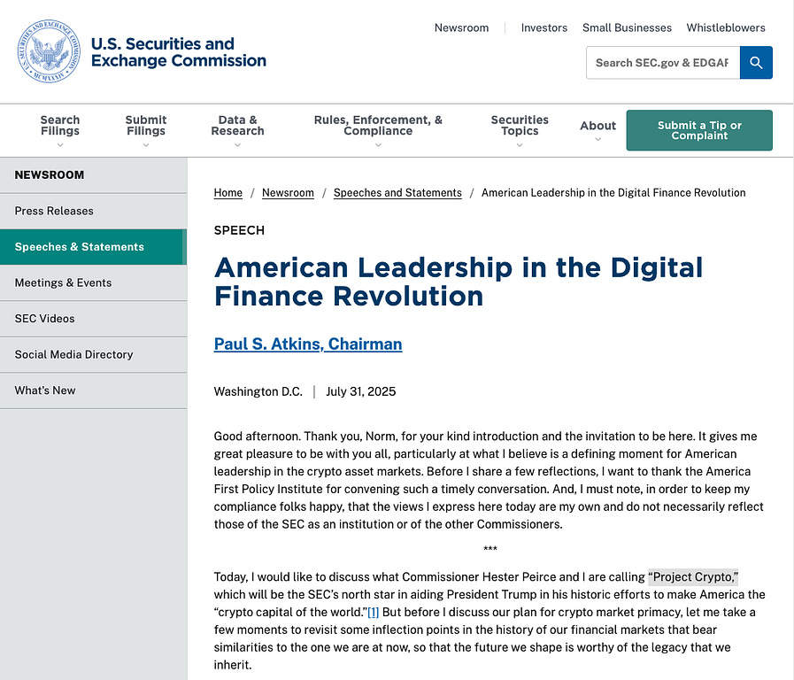 2025年7月31日、米証券取引委員会(SEC)のポール・S・アトキンス委員長は、米国の金融市場におけるデジタル変革を主導するための国家的プロジェクト「プロジェクト・クリプト」を発表。これは、トランプ政権が掲げる「米国をクリプトの世界的首都とする」という野心的な目標を、具体的な規制改革を通じて実現しようとするものです。SECがこれまでの慎重な姿勢から一転し、イノベーションを積極的に後押しする方向へと舵を切ったことは、世界の金融市場に大きな影響を与えることが確実視されています。