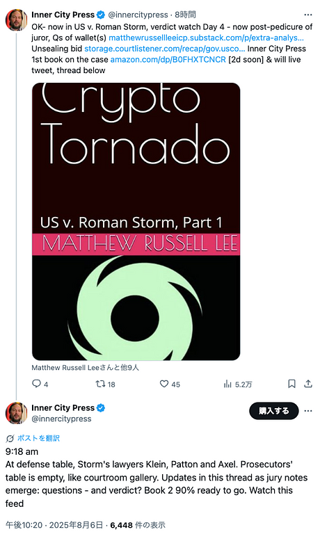 以下、@innercitypressの投稿を参考に、Tornado Cashの開発者であるローマン・ストーム氏の判決概要を以下にまとめます。ご参考までに。