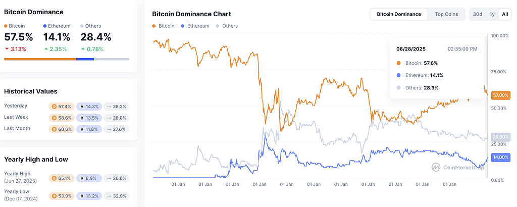 現在のETHドミナンスは14~15%帯に乗り、年初来の高水準で推移しています。対照的にBTCドミナンスは60%割れ前後まで低下しました。価格面でもETHは8月に過去高値を更新しており、「価格の上抜け」と「相対シェアの切り上げ」が並走しているのが現在地です。