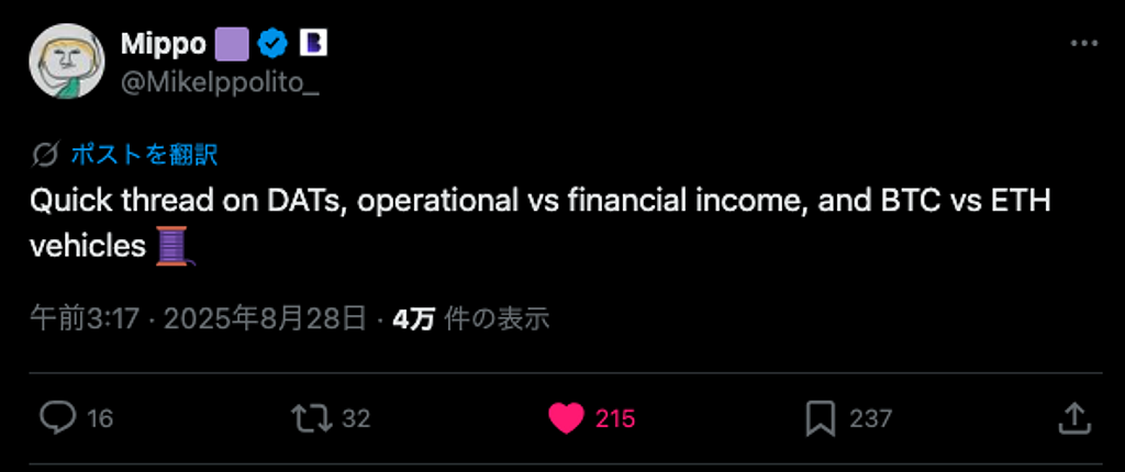DATs(Digital Asset Trusts/デジタル資産トラスト)は、しばしば「保険会社」に例えられます。その理由は、収益の源泉が大きく2つに分かれており、保険会社のモデルと似た構造を持っているからです。Mike Ippolito氏はこの点を強調し、DATsの仕組みをより理解しやすく説明しています。