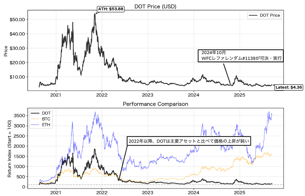 このような上限のないインフレ設計から、投資家の間では「成長を優先したモデル」と見なされることが多く、希少性の弱さや価格への下押し圧力が懸念されてきました。実際、DOTの価格は2021年に50ドルを超える場面があったものの、その後は長期低迷し、直近では4ドル台にとどまっています(図表2)。