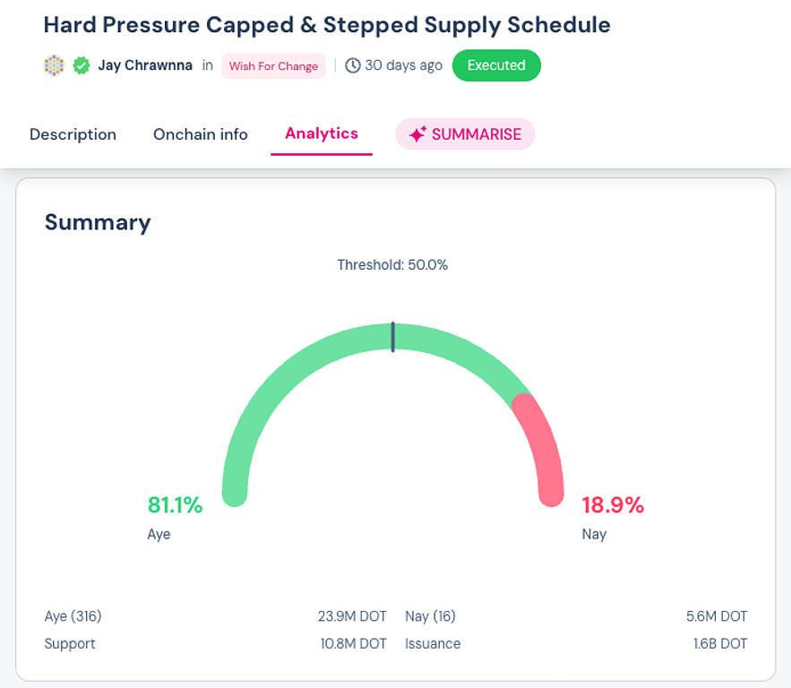 2025年9月、Polkadotのコミュニティで「Referendum 1710」という提案が可決されました。これは、DOTという通貨の発行量を最大21億枚までに制限するという考え方に「賛成しますか?」と問いかけたものです。実際の投票では81%が賛成を示し、多くの参加者がこの方向性を支持しました。(図表1)