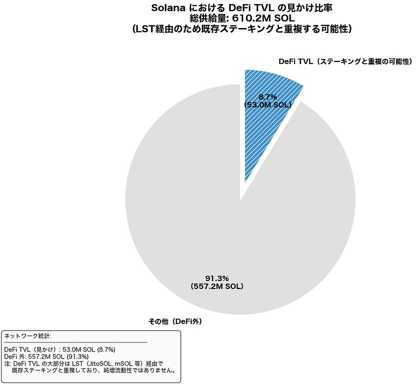 Solana DeFi の TVL は約 5,300 万 SOL。ただしその多くは JitoSOL、mSOL などの LST(ステーキングの証券化トークン)であり、新たにロックされた資金というより既存ステークの派生表現です。TVL の数値をそのまま「資金流入」とみなすのは誤解を招きやすく、実態を読み解くには分解が必要です。本稿ではホルダー構造に焦点を置くため、この内訳の詳細分析は割愛します。