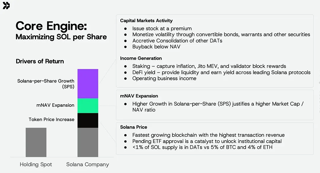 HSDTは二つの経路でSOL per shareを強化します。第一に資本市場アクション(プレミアム発行、ボラティリティを用いたCB活用、NAV割れでの自社株買い)。第二に収益化(保有SOLのステーキングとDeFi利回り獲得)。Solanaのネイティブ利回りは概ね年率7%で、個人には煩雑な運用を上場車両が一括で代行します。結果として、mNAV拡大→株価の上昇余地、に加えてSOL自体の価格上昇もリターンに寄与します。