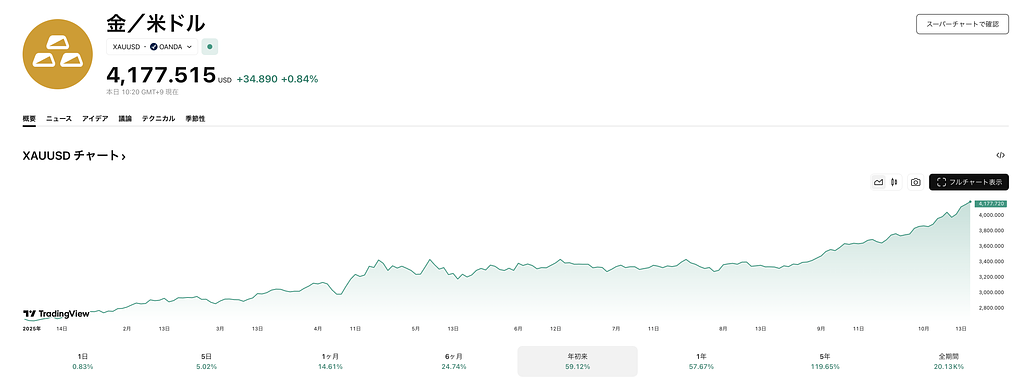 ゴールドの価格連騰が止まりません。ビットコインに対する年初来パフォーマンスは大きく差が開きました。