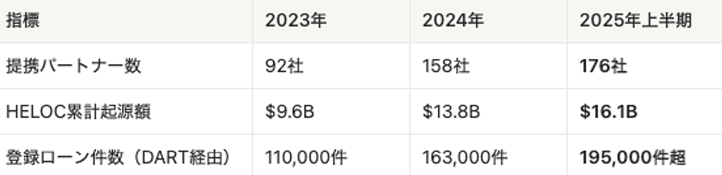 Figureは自社ブランドの貸付に加え、金融機関やモーゲージバンク向けにホワイトラベル提供(Partner Lending)も行っています。提携先はFigureのシステムを自社名義で利用できるため、低コストかつ短期間でオンラインHELOC商品を立ち上げ可能です。