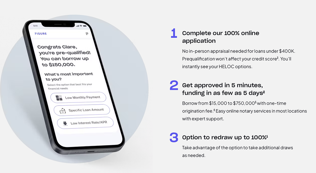 Figureの出発点は、個人の住宅資産を担保としたHELOC(Home Equity Line of Credit)事業です。オンライン完結型のプロセスを特徴とし、申請から資金提供まで平均10日未満という業界最速水準を実現しています。