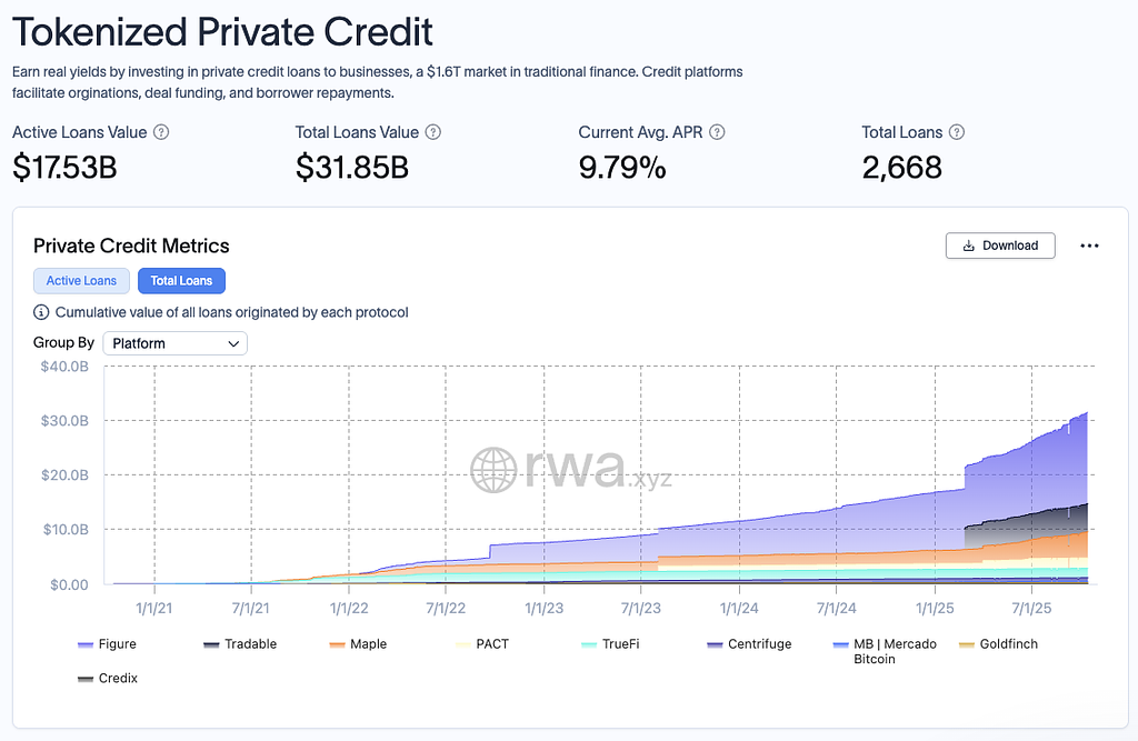 このモデルはすでに170社超の金融機関に導入されており、rwa.xyzによれば累計HELOC発行額は160億ドルを突破しています(2025年9月時点)。プライベートクレジット市場におけるローン残高は、7割を超えています。