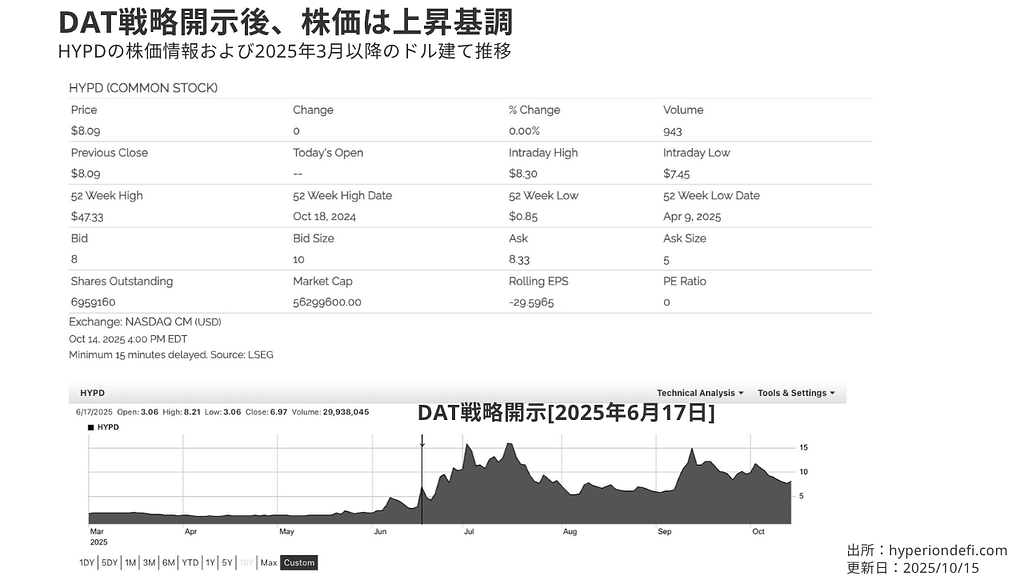 その対象として今回取り上げるのがHyperionDeFi,Inc.(旧Eyenovia)です。眼科医療ベンチャーとして歩みを始めた同社は、2024年以降、経営破綻寸前の“三重苦”――資金繰りの悪化、高金利負債の圧迫、Nasdaq基準違反――に直面しました。そして打開策として選んだのが、暗号資産プロジェクトHyperliquidのトークン「HYPE」を大量に取得するDAT戦略でした。