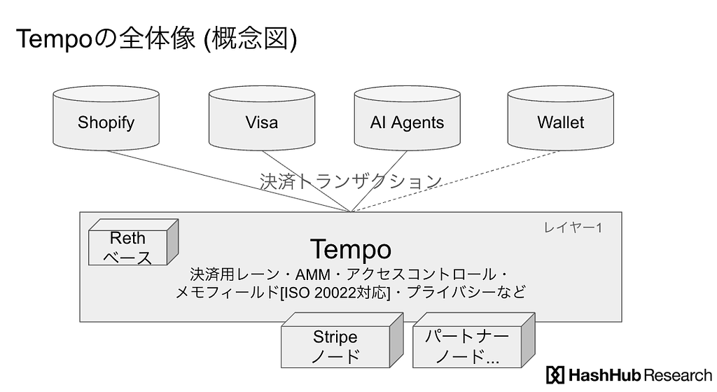 このTempoは、主にステーブルコイン・決済に特化したレイヤー1ブロックチェーンです。Tempoネットワークの設計段階からOpenAI、Shopify、Visa、Anthropic、ドイツ銀行など複数の有力企業が参画しており、すでにこれらパートナー企業と連携したテストが進められているとのこと。