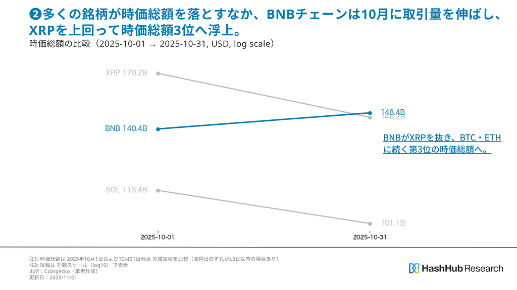 こうしたユーザー活動の拡大を背景に、BNBのネイティブトークン$BNBは史上最高値を更新。時価総額でXRPを抜き、BTC・ETHに次ぐ第3位へと浮上しました(図表2参照)。
