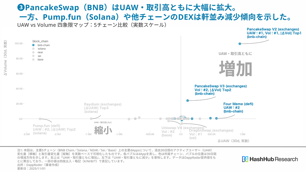 BNBチェーン拡大 の背景を解剖する|PancakeSwap / FourMeme のUAW・Volume分析―アプリケーション勢力図から見るクリプト市場(2025年10月)