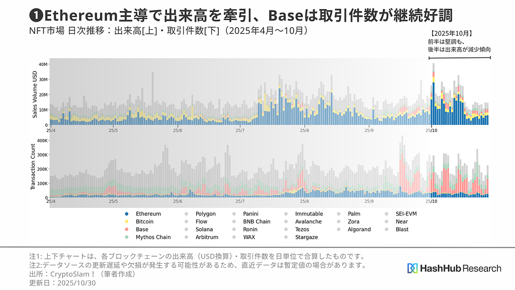 2025年10月のNFT市場は、Ethereumが出来高を牽引。夏場に一度盛り上がった後に沈んでいた市場は、10月に入って再び回復基調を見せました。特に10月前半は大きな盛り上がりを記録しましたが、後半はやや勢いが鈍化。