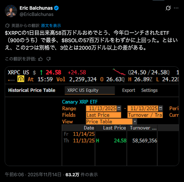 先日、米国で初のスポットXRP ETF(上場投資信託)となるCanary Capital社の「XRPC」ファンドが11月13日に上場し、初日から約5,800万ドルの出来高を記録したことが話題となりました。これは、2025年に新規設定されたETF全体(約900本以上)の中で最大の初日取引高となり、10月末にデビューしたBitwise社のSOL ETF(BSOL)の5,700万ドルを僅かに上回るものとされています。