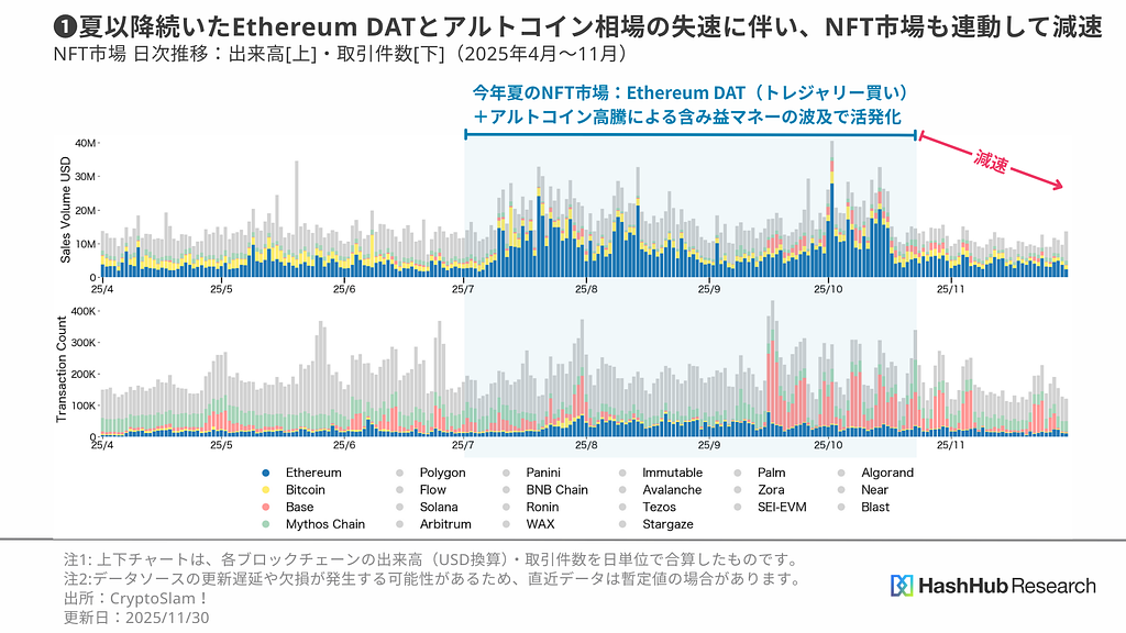 2025年11月のNFT市場は、出来高の面では引き続きEthereumが中心となりました。夏場には、Ethereum DAT(トレジャリー買い)とアルトコイン高騰による含み益マネーの波及を背景に市場はいったん大きく活発化しましたが、その後は沈静化。
