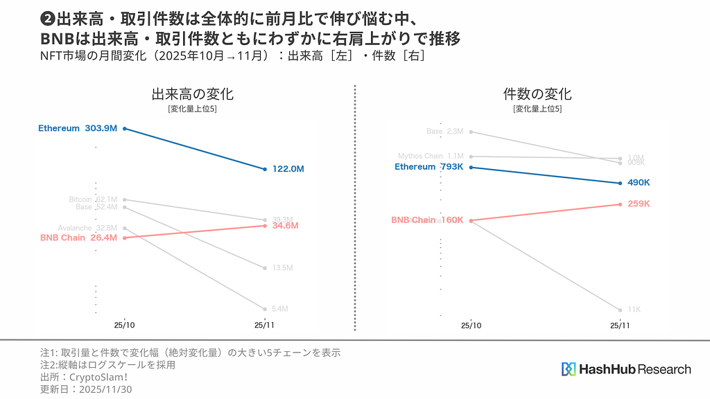 図表2では、出来高[左]と取引件数[右]について、10月から11月にかけて変化量が大きかった上位5つのチェーンを可視化しています。