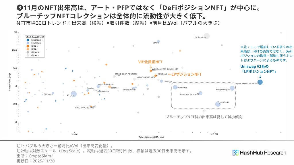 図表3は、2025年11月のEthereumおよびBNB上の出来高上位コレクションを、「出来高(横軸)×取引件数(縦軸)×出来高変化量(バブルの大きさ)」で示したバブルチャートです。前回10月は突出した単一プロジェクトが市場全体の出来高を押し上げる構図が見られましたが、11月は様相が大きく異なります。11月は、ブルーチップNFTや従来型のアート・PFP系コレクションの出来高・取引件数が総じて縮小しており、投機目的での売買が成立しにくい市場環境へと明確に移行している様子が確認できます。出来高の減少は単なる価格下落ではなく、市場に供給されていた流動性そのものが細ってきていることを意味しており、短期的な回転売買が成立しづらい構造に移りつつあると整理するのが実態に近いでしょう。