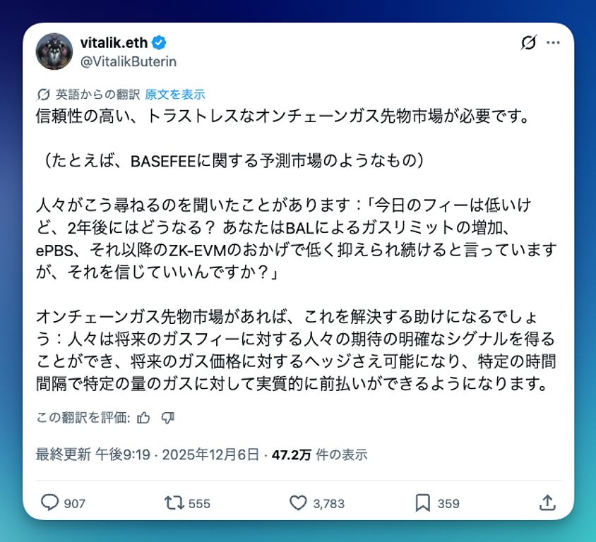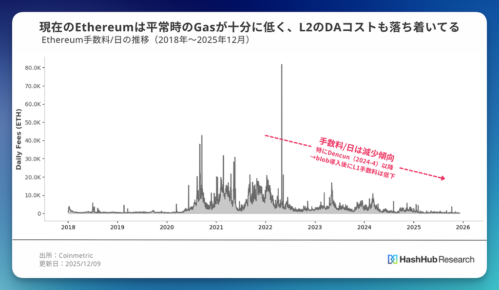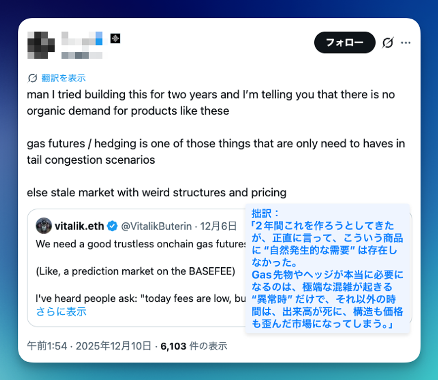 また、現在のEthereumは平常時のGasが十分に低く、L2のDAコストも落ち着いており、少なくとも“今この瞬間”において、L2運営者、AA事業者、清算Bot、MEV事業者がこぞってGasヘッジに殺到している状況にはない。実際、「2年作ったが自然発生的な需要はなかった」「必要なのは極端な混雑時だけで、その他の時間は市場が死ぬ」という実務寄りの証言も少なくない。