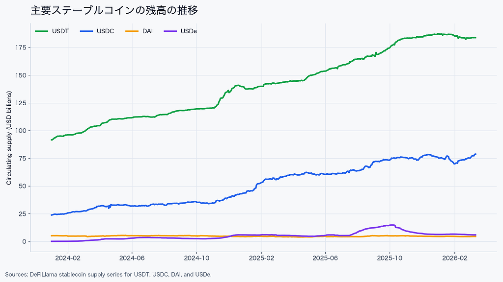 この時期、複数の金融当局と調査機関が、ステーブルコイン普及に伴う銀行預金からステーブルコインへの資金シフトをほぼ同時に論じ始めた。2026年3月12日現在のところ、主要ステーブルコインの供給量は2,732億ドルである。