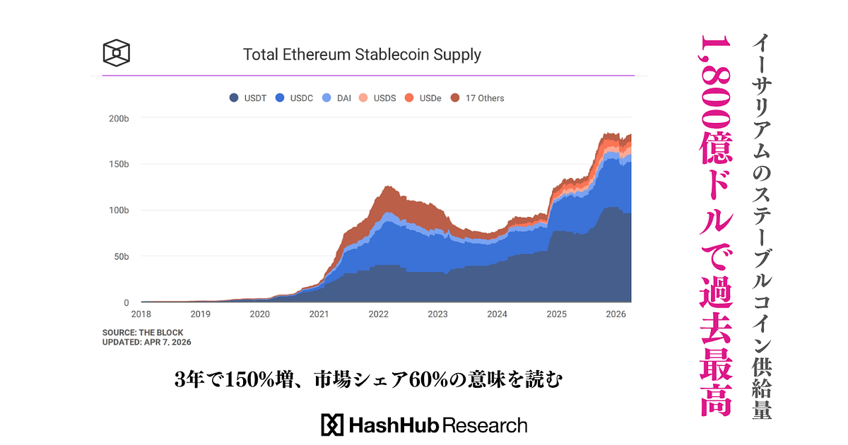 Ethereumのステーブルコイン供給量が1,800億ドルで過去最高|3年で150%増、市場シェア60%の意味を読む