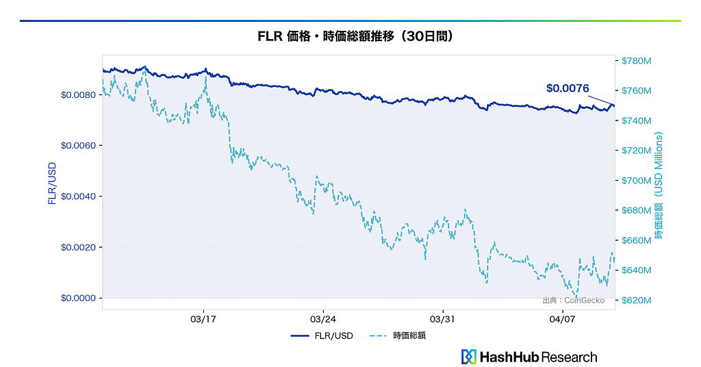 図1: FLR価格は30日間で約$0.009から$0.0076へ下落。時価総額は約6.5億ドルで推移。出所: CoinGecko