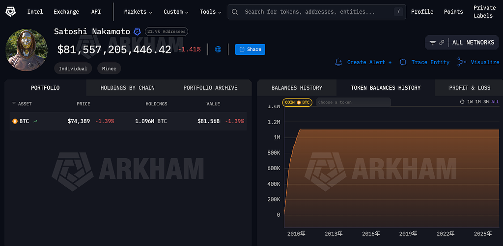 なかでも象徴的な「金庫」の持ち主は、ビットコインの創設者でありながら今も正体不明のサトシ・ナカモトであり、ブロックチェーン分析プラットフォームArkhamの推計によれば、サトシに紐づくウォレットは約109.6万BTC(2026年4月20日時点で約815億ドル相当)を保有している(出所:Arkham Intel — Satoshi Nakamoto, 2026年4月20日閲覧)。このサトシの保有分は脆弱とされる全BTCの約6割を占めており、いわば量子リスクのシンボル的存在である。
