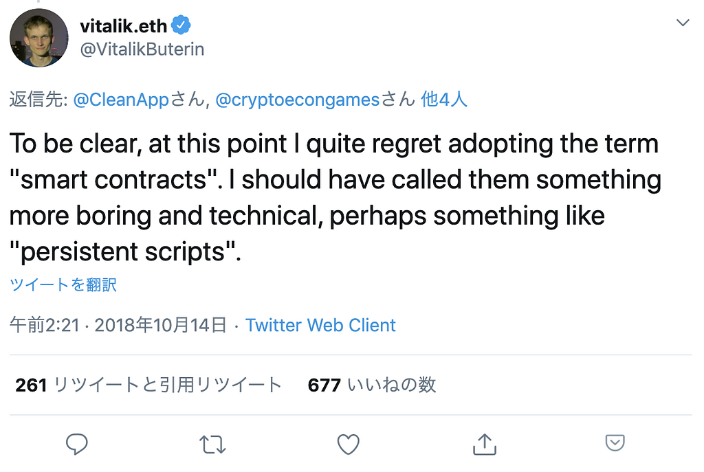 スマートコントラクトという言葉ではなく「persistent scripts」などといったテクニカルの言葉を使うべきだったと発言しています。直訳をすると、「永続性のあるスクリプト言語」という意味です。